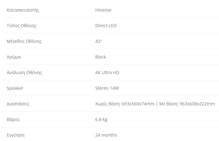 Ανακαλύψτε την Smart TV Hisense 43A6N 4K Ultra HD 43" LED HDR D-LED QLED με τις παρακάτω δυνατότητες: Διαγώνιος οθόνης: 109,2 cm Τύπος οθόνης: 43" Ανάλυση: 4K Ultra HD Χρώμα: Μαύρο Υλικό: Πλαστική ύλη Χαρακτηριστικά: Περιήγηση στο Web, Μείωση θορύβου, Ισοσταθμιστής, Διακόπτης ενεργοποίησης / απενεργοποίησης, Smart TV, Τηλεtext, Ηλεκτρονικός οδηγός προγράμματος (EPG) Συνδέσεις: USB 2.0, Ethernet LAN, HDMI 2.1 x 1, HDMI 1.4 Συμβατότητα: Amazon Alexa Λειτουργίες: Timeshift Τροφοδοσία Ρεύματος: Εναλλασσόμενο ρεύμα Ανάλυση: 3840 x 2160 px Γωνία θέασης: 178º Ενεργειακή κατάταξη: E